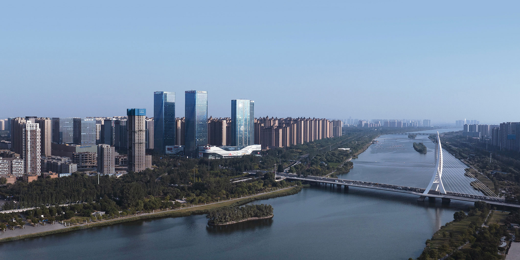 項(xiàng)目位于太原人文歷史軸線(xiàn)——汾河沿岸,同時(shí)被晉陽(yáng)湖公園、祥云公園等六大生態(tài)公園環(huán)繞,是城市發(fā)展的核心地段。商務(wù)中心由三棟